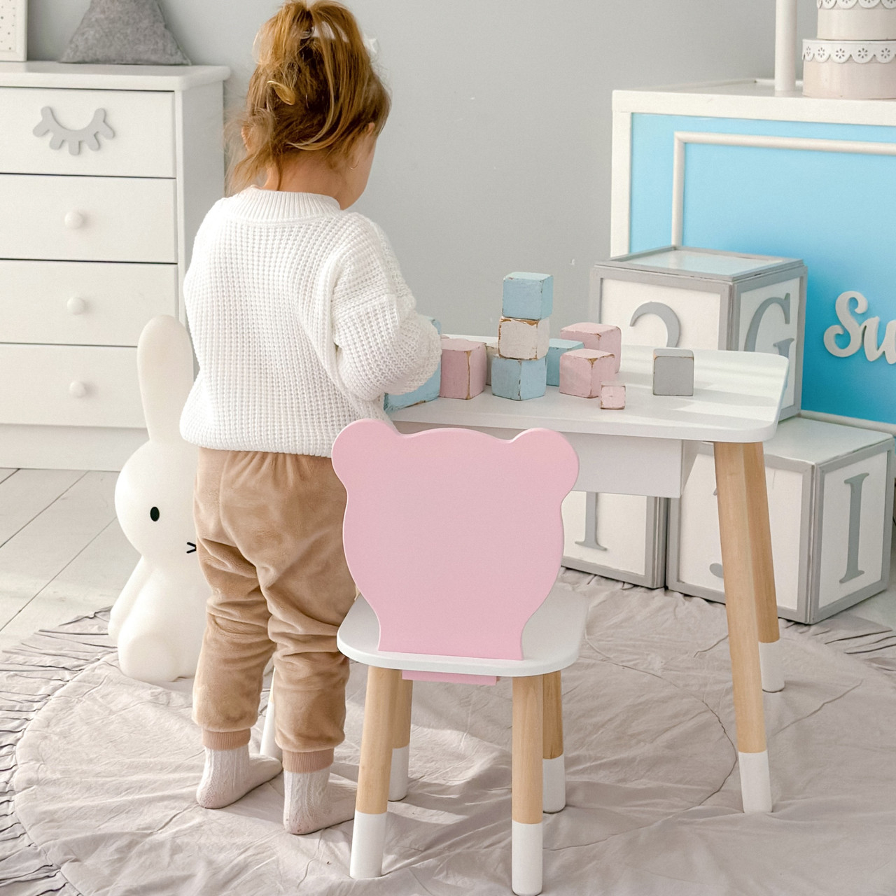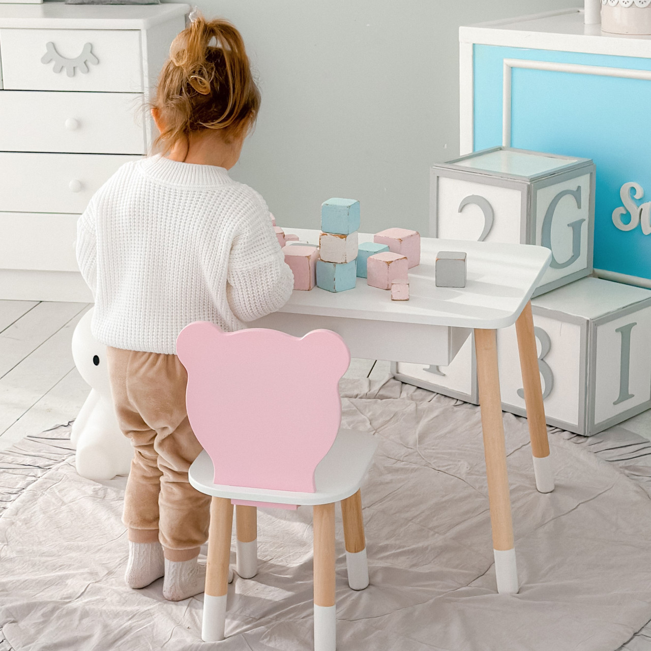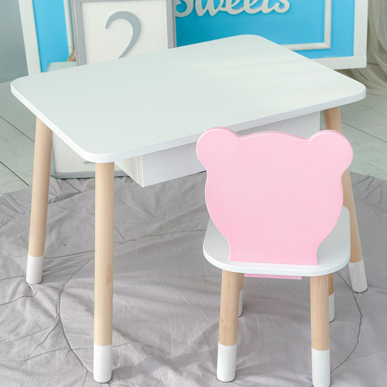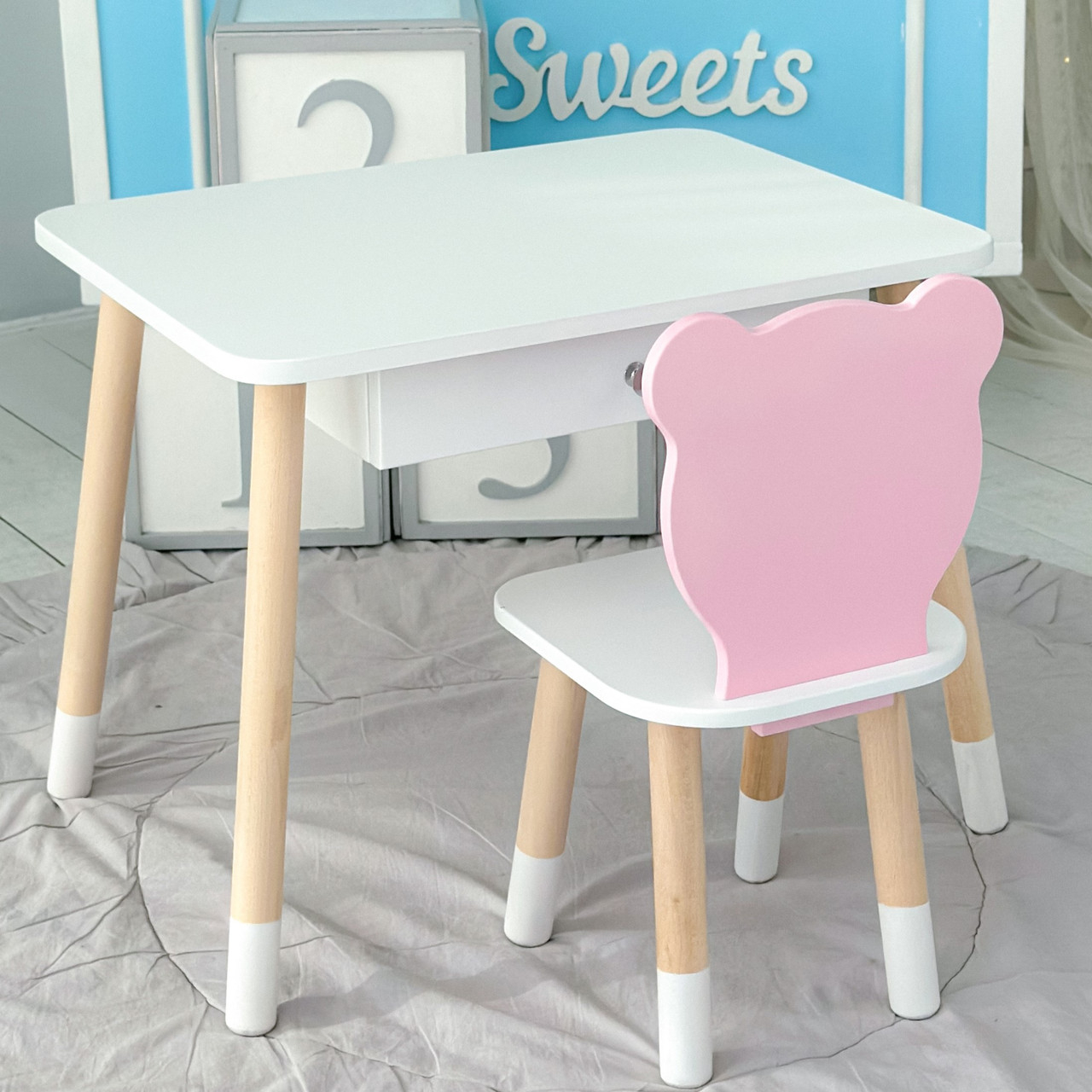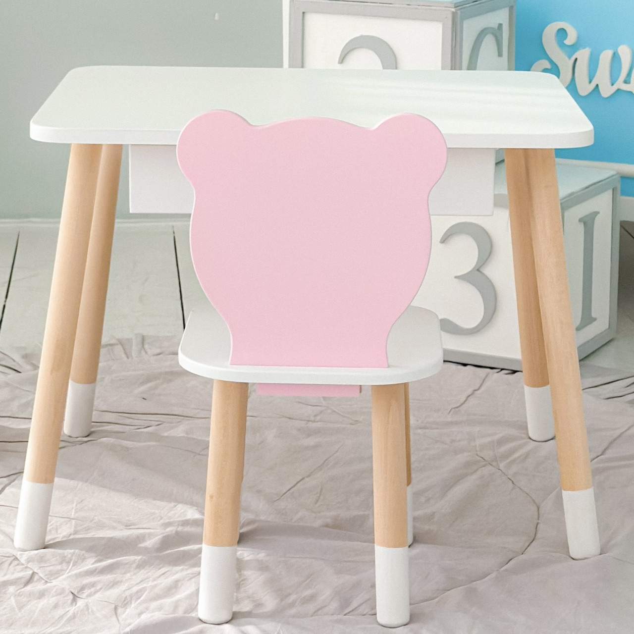 Дитячий столик білий і стільчик ведмедик рожево-білий. Столик із шухлядою для олівців і розмальовок 21441