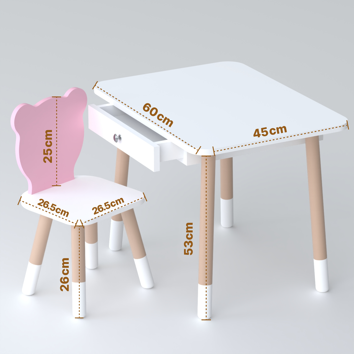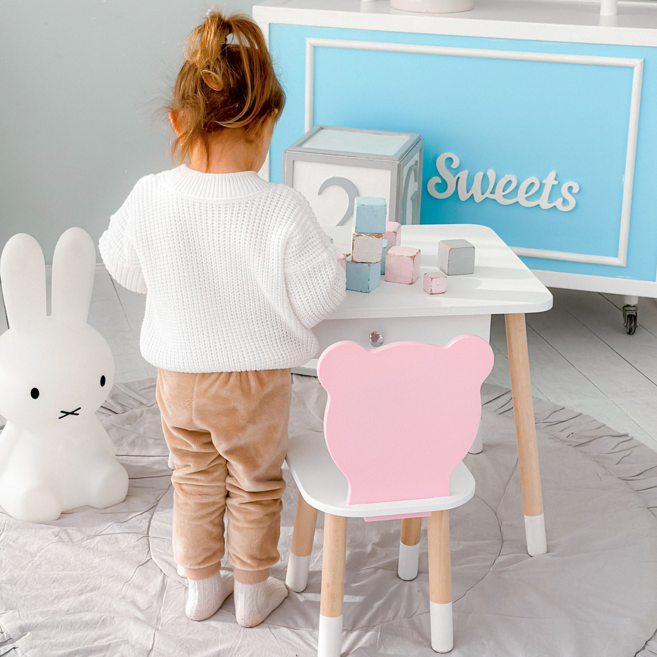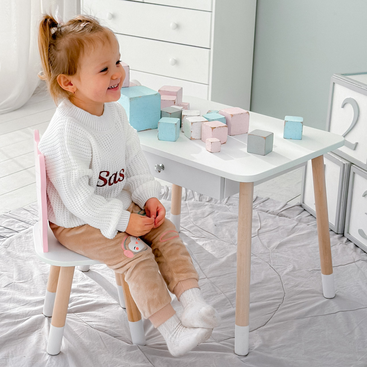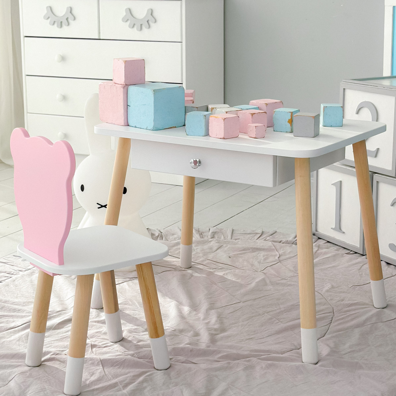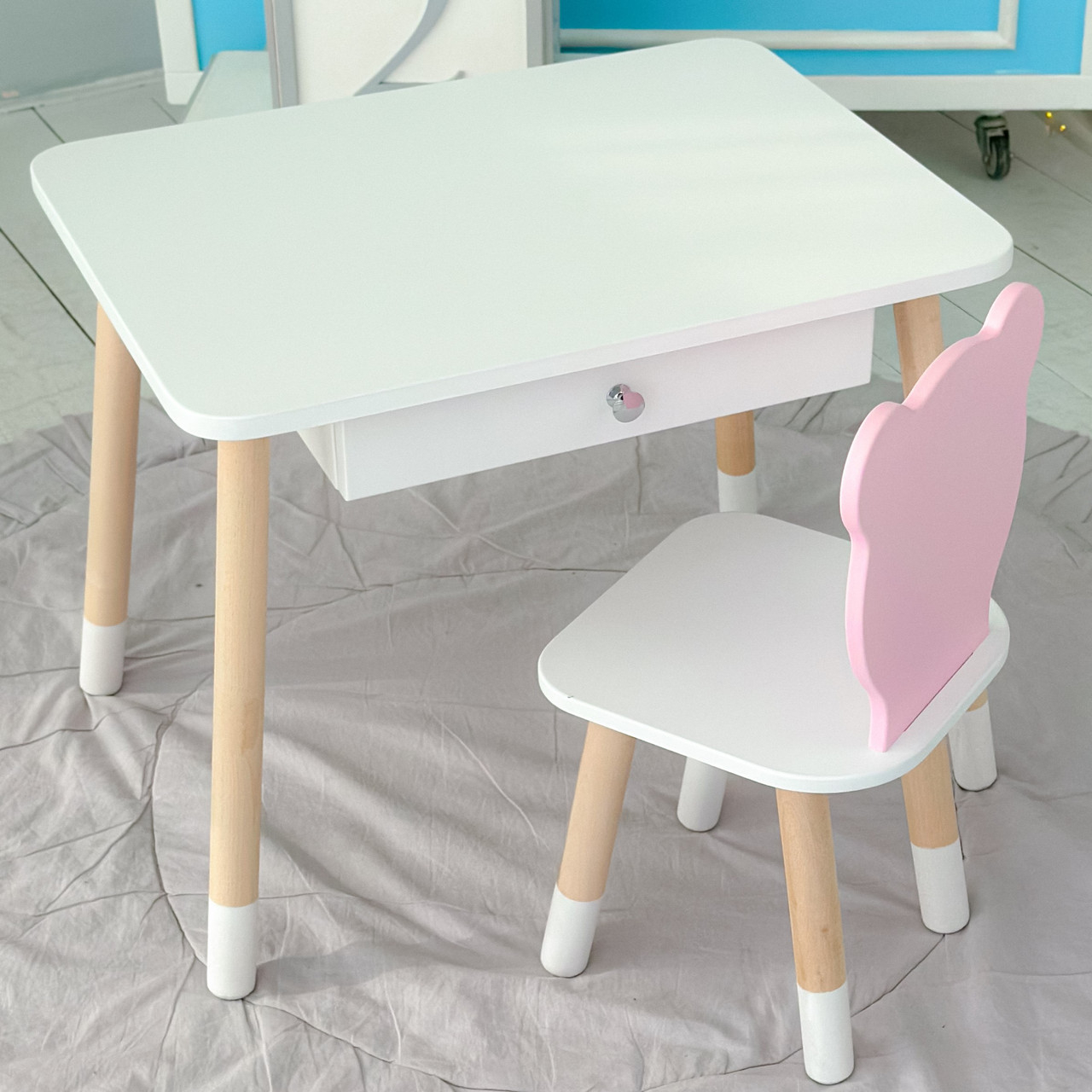 Дитячий столик білий і стільчик ведмедик рожево-білий. Столик із шухлядою для олівців і розмальовок 21441