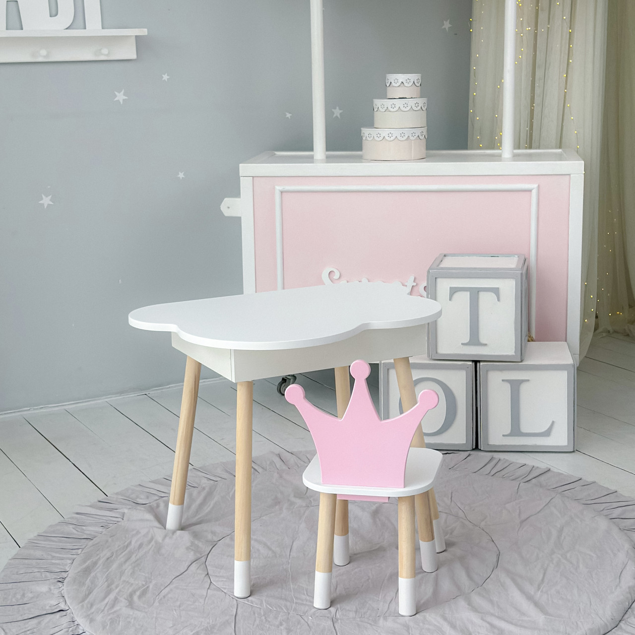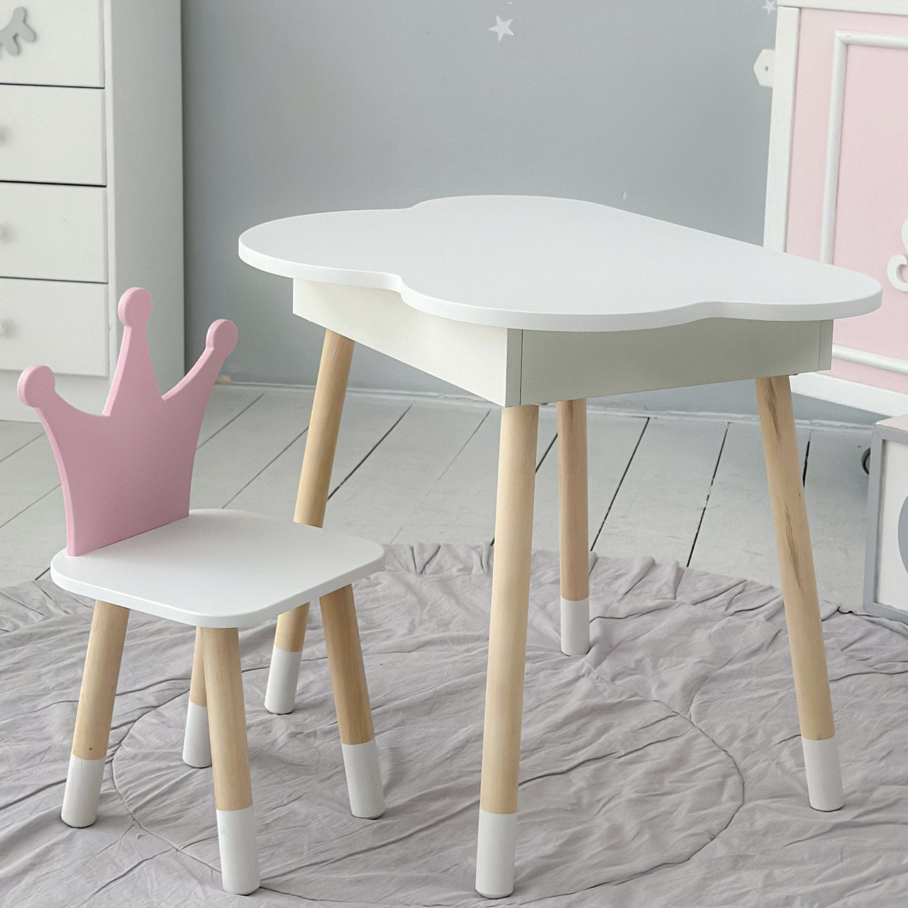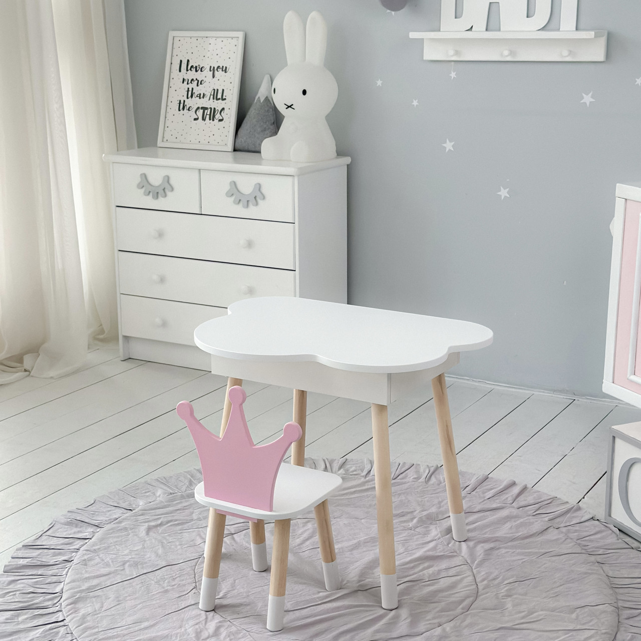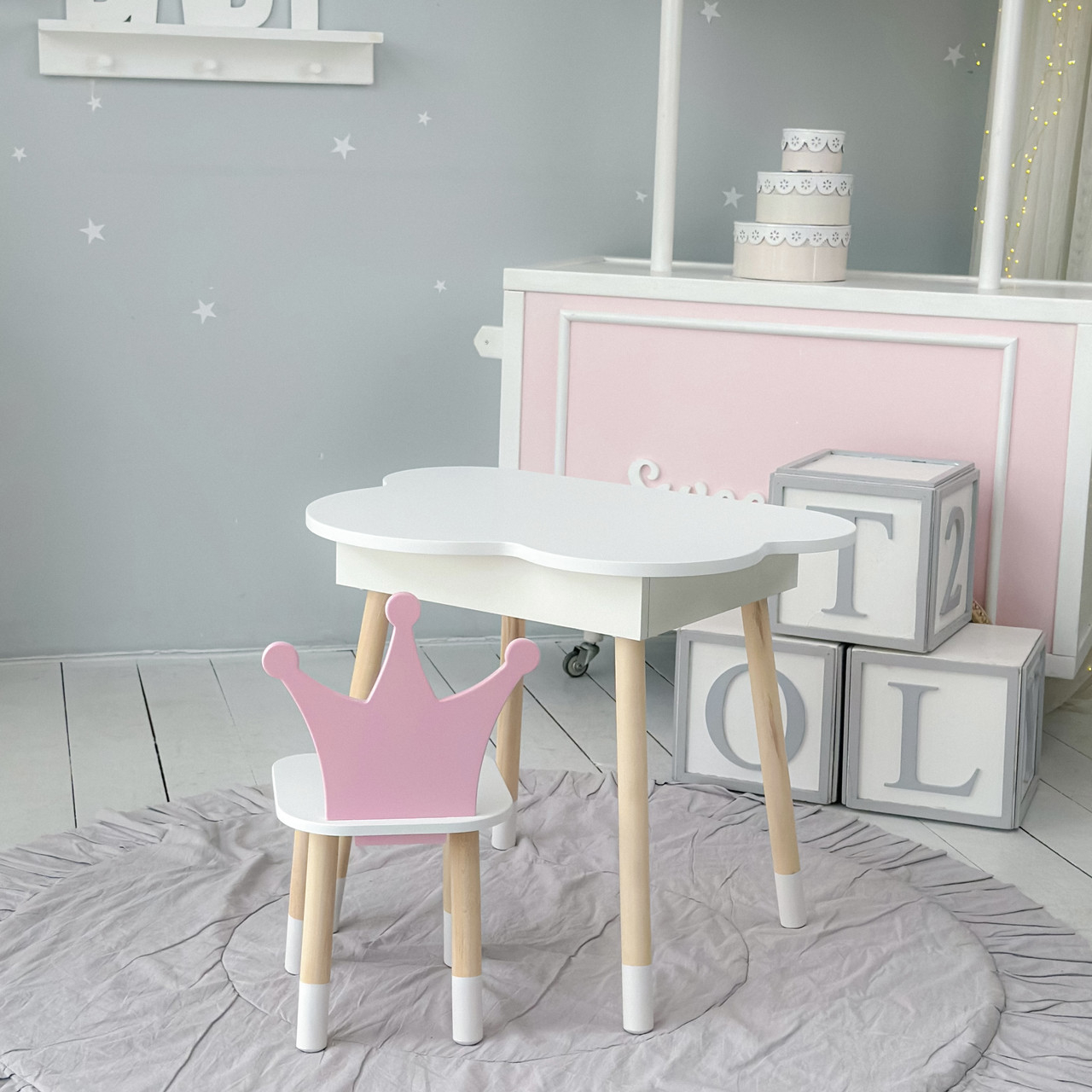 Новинка! Дитячий стіл білий хмарка з нішею і стільчик корона рожевий 85866