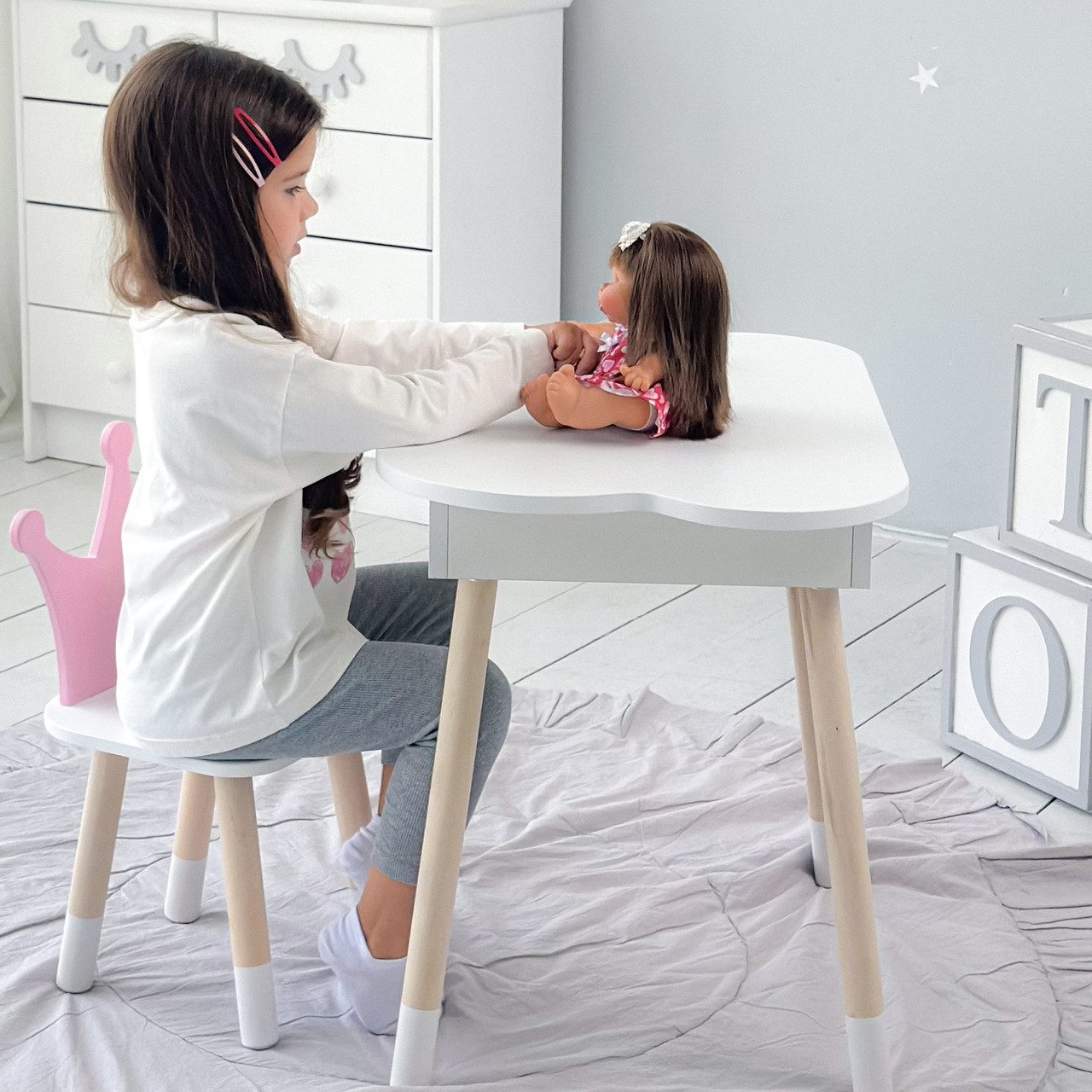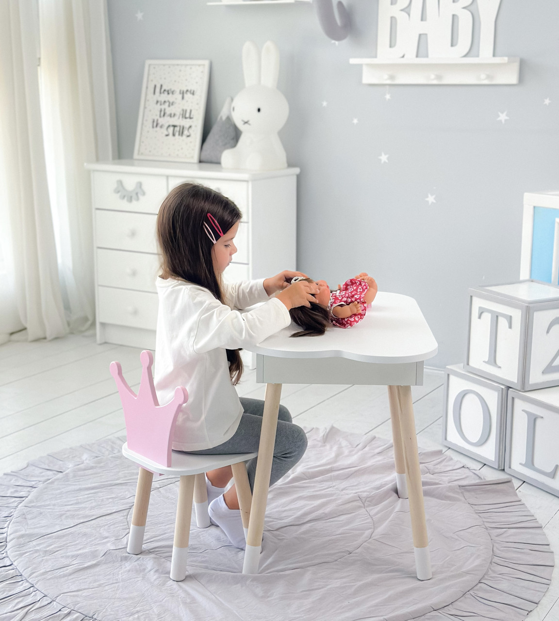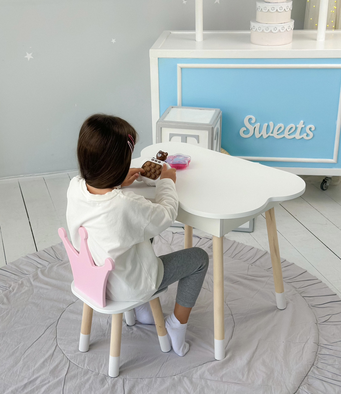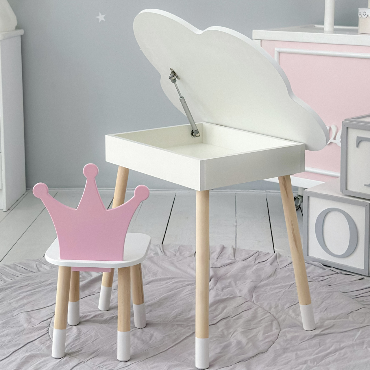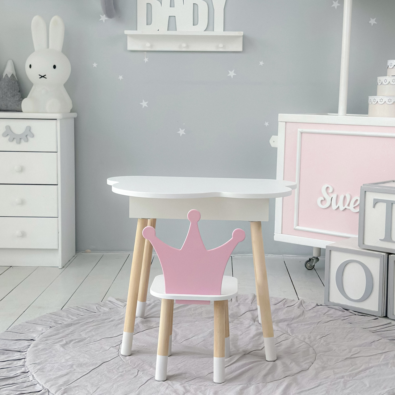 Новинка! Дитячий стіл білий хмарка з нішею і стільчик корона рожевий 85866