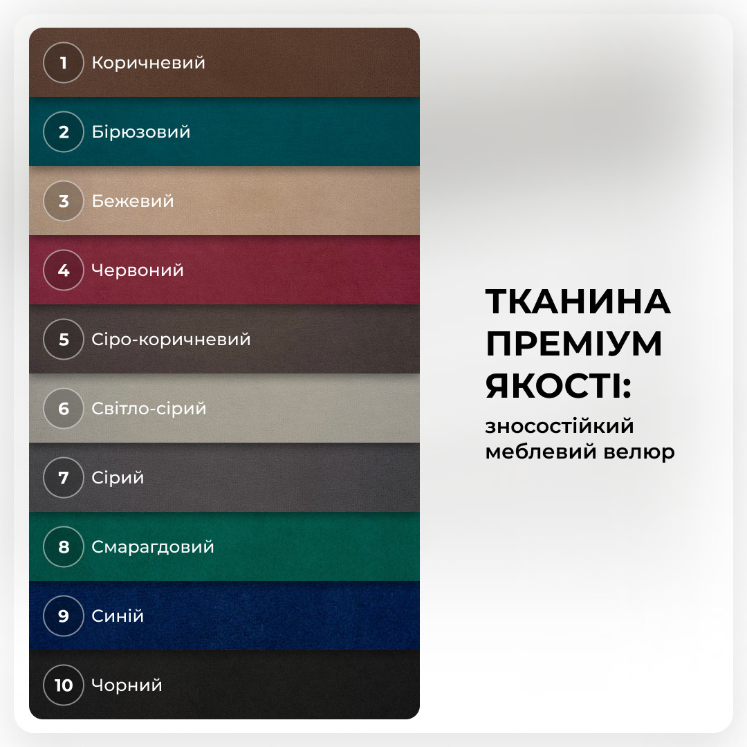 Цвет обивки: Коричневый (1), Бирюзовый (2), Бежевый (3), Красный (4), Серо-коричневый (5), Светло-серый (6), Серый (7), Изумрудный (8), Синий (9), Черный (10)
