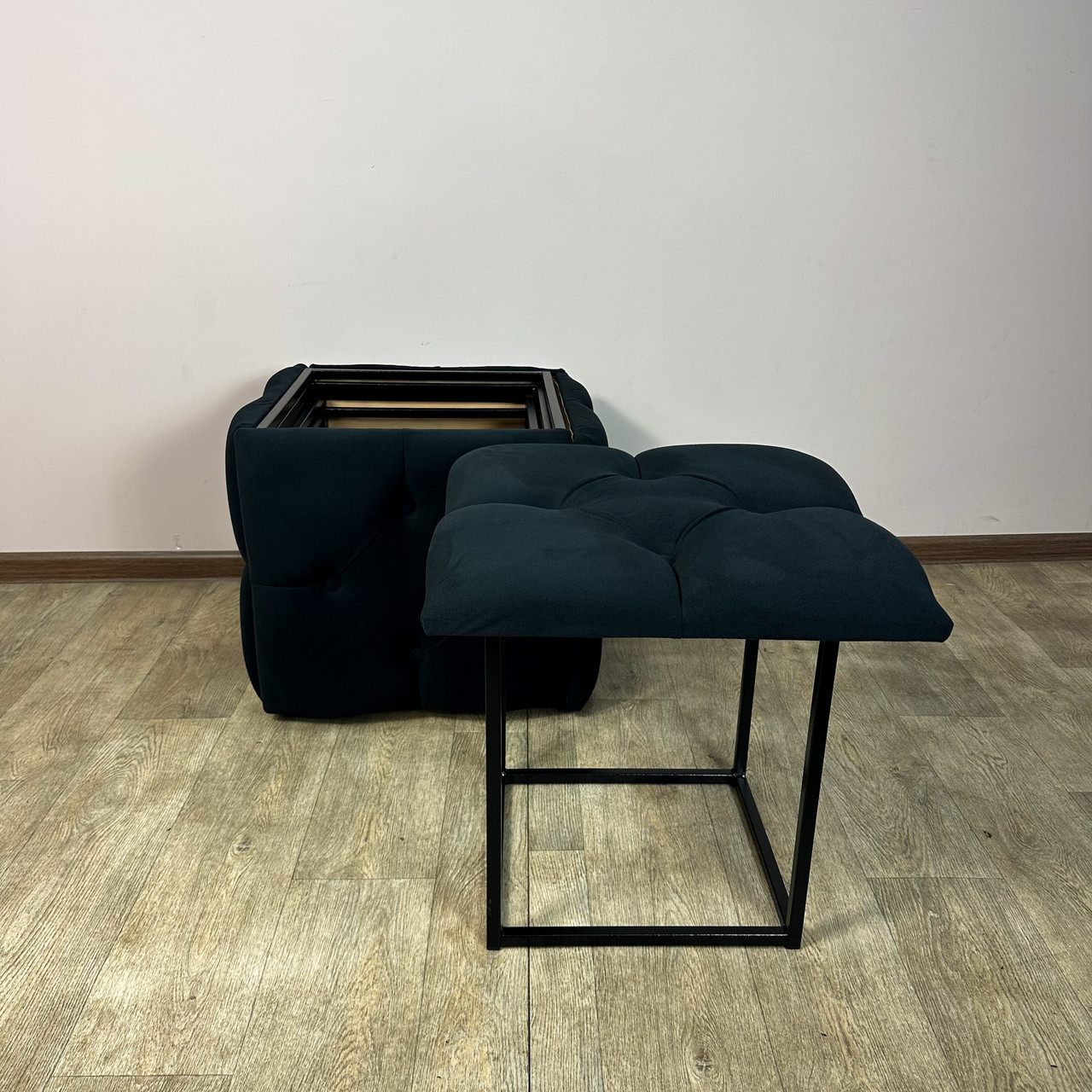 Пуф раскладывается на 5 металлических стульчиков с мягкими сиденьями высотой 45 см.